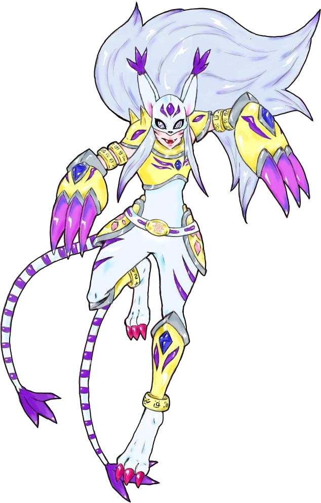 The first one is my (minimal) edit of @nerrax's Rakshamon, which he imagined as a "biomerge" evolution of Tailmon and Hikari Yagami: